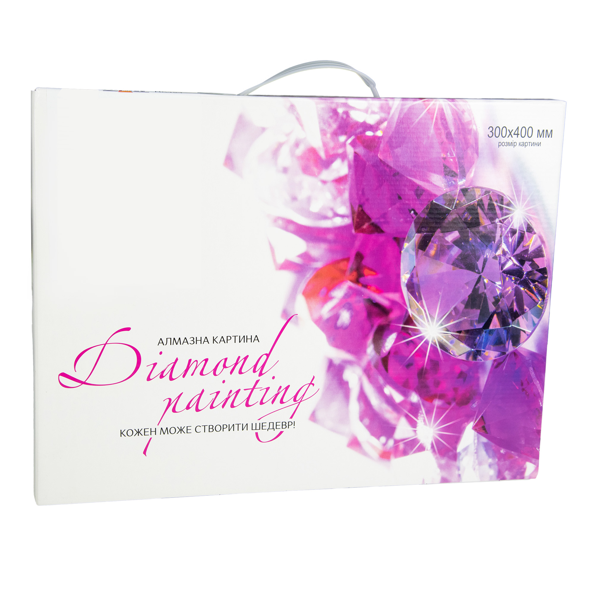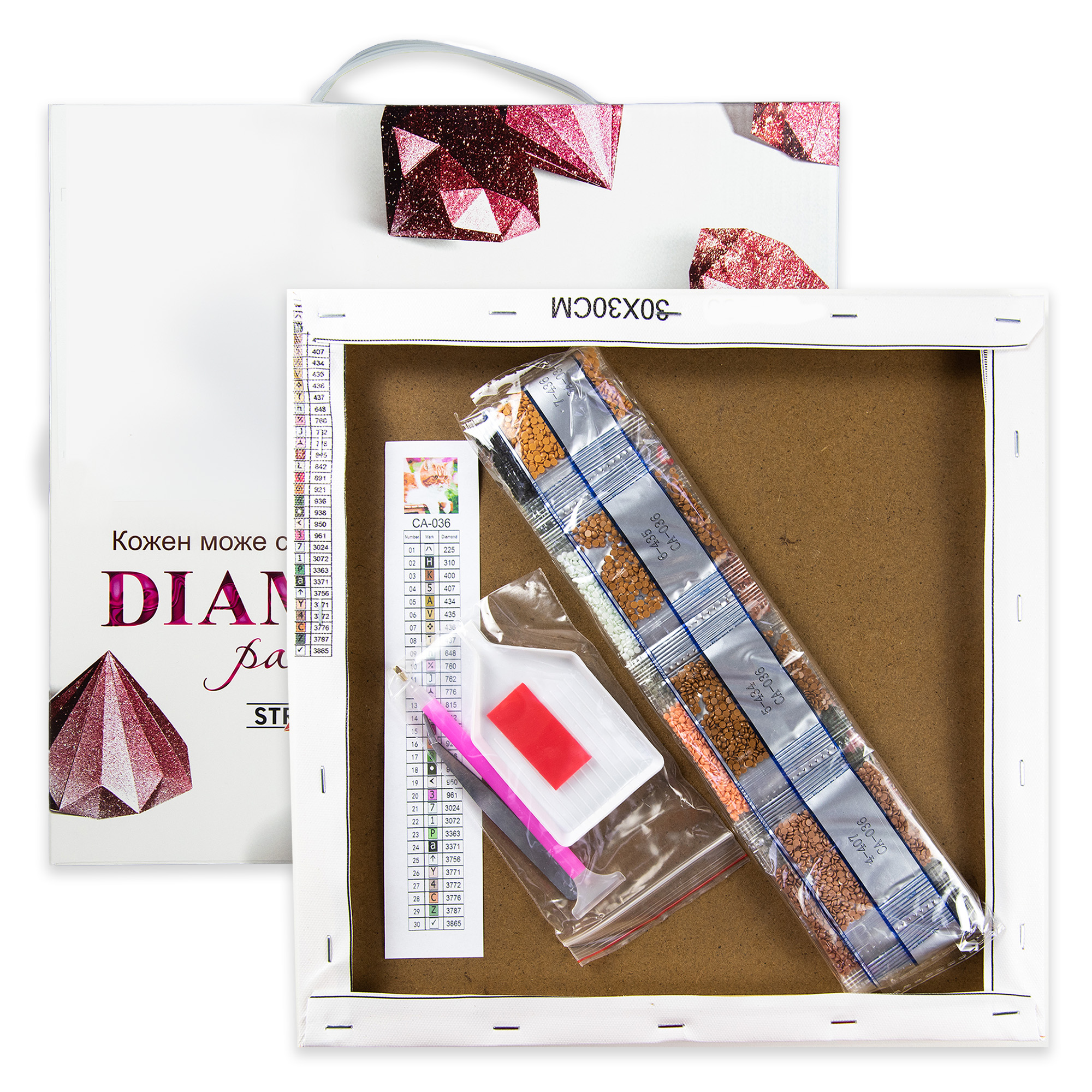 Canvas with an adhesive layer; wooden subframe; acrylic rhinestones according to the completeness of the set; tweezers for rhinestones; special pen-stylus for working with rhinestones; gel glue; tray for sorting rhinestones.