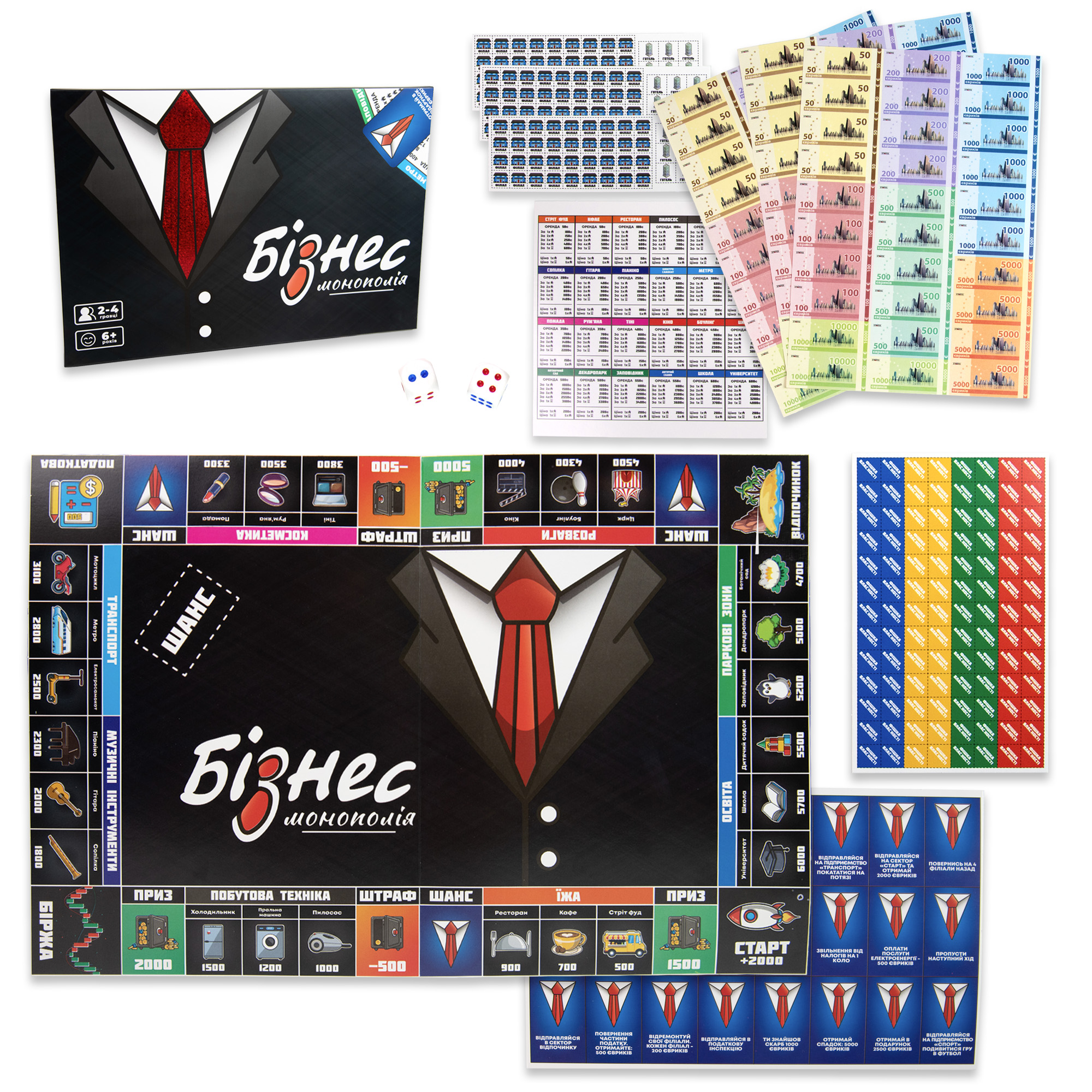 ♦ Комплектация игры: игровое поле, фишки 4 шт., игровой кубик 1 шт., карты «Шанс», карты «Фишки собственности», 24 филиалов, игровые банкноты, инструкция (на коробке).