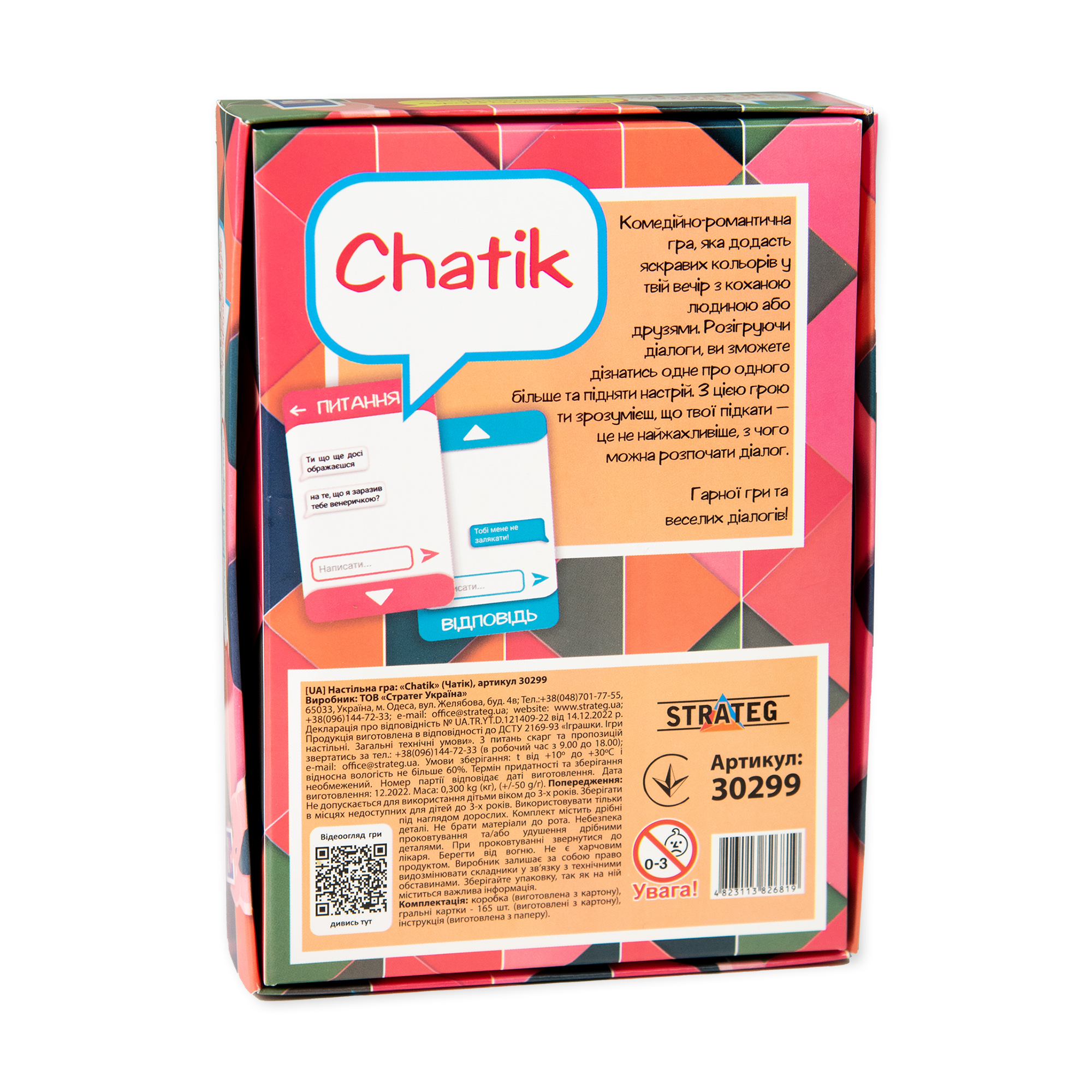 The board game from the Ukrainian manufacturer Strateg "Chatik" (30299) is a comedy-romantic game in the Ukrainian language that will add bright colors to your evening with your loved one or friends. By acting out dialogues, you can learn more about each other and lift your spirits. With this game, you will understand that your prompts are not the most terrible thing to start a dialogue with. Good game and fun dialogues!