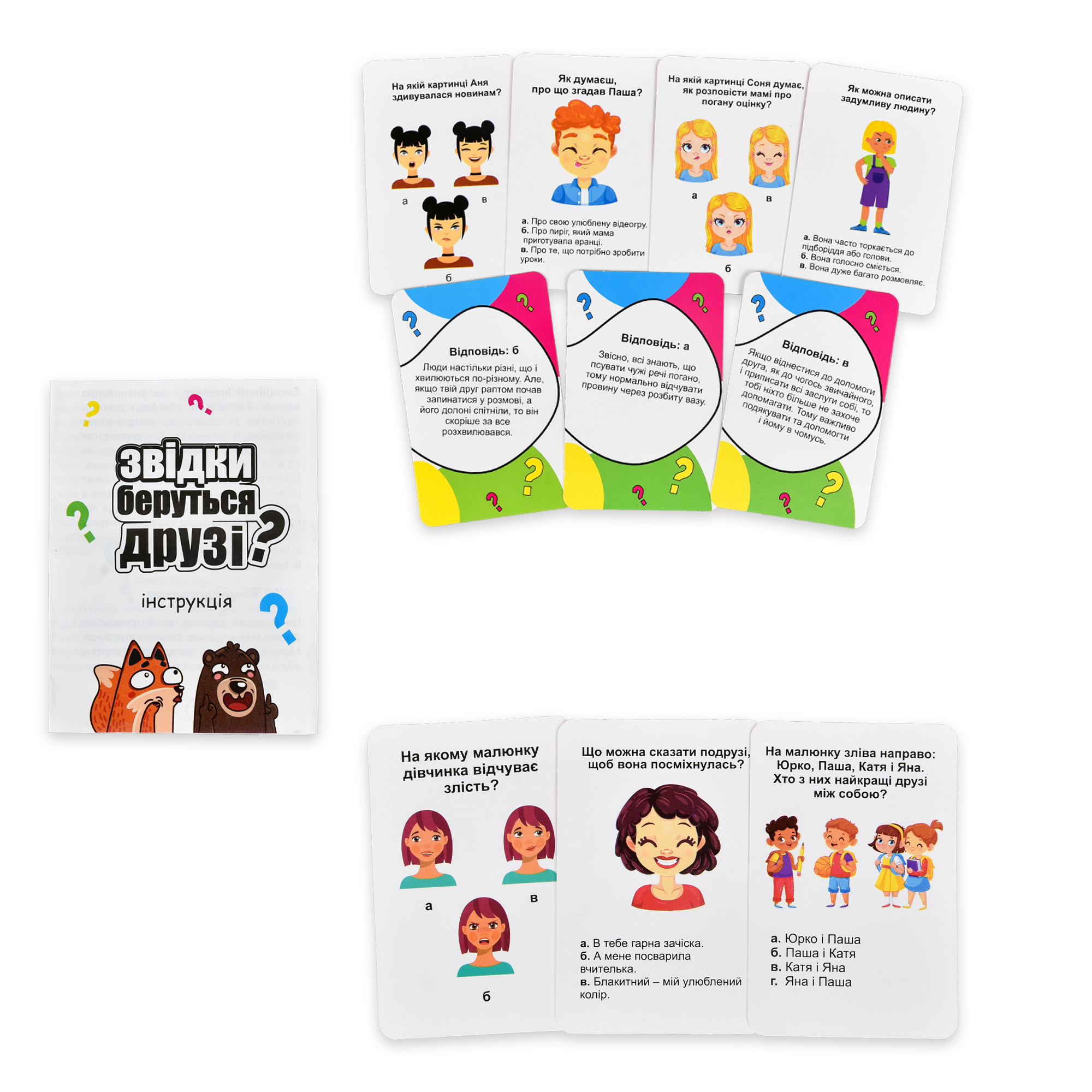 «Откуда берутся друзья?» Strateg (30238) – легкий способ в игре показать ребенку, какие бывают в жизни ситуации и как можно вести себя, чтобы избежать неприятностей или никого не обидеть. Вопросы на карточках достаточно просты, и на оборотах можно прочитать ответ, который считается наиболее приемлемым в обществе. Можете играть наедине, а можете играть в команде, прислушиваясь к мнению друг друга. В первую очередь «Откуда берутся друзья?» – игра для развития эмоционального интеллекта, но она развивает коммуникативные навыки и позволяет интересно провести время.