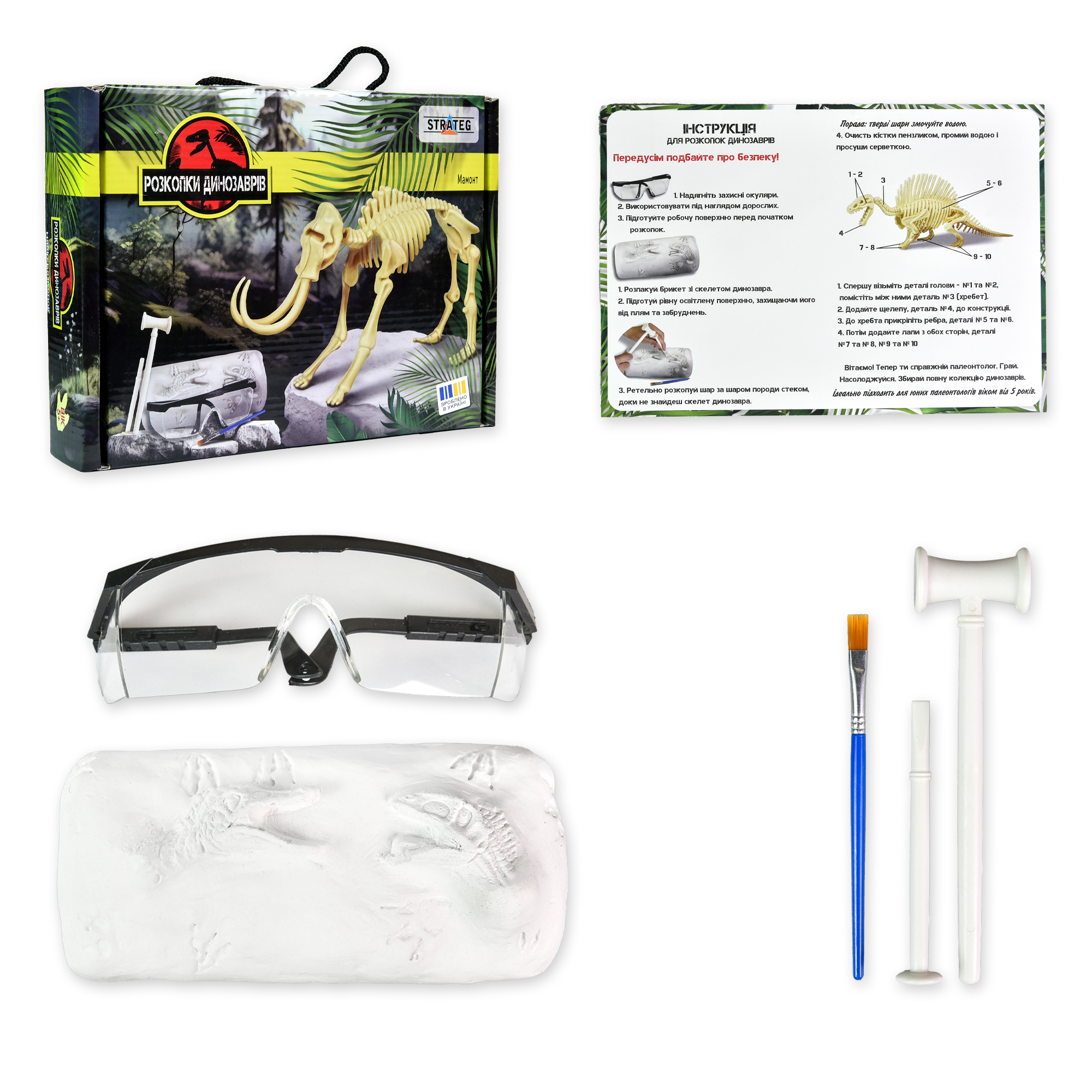 Набор для творчества "Раскопки динозавра. Мамонт" — интересный и увлекательный набор для любознательных исследователей. В коробке вы найдете необходимые инструменты, защитные очки, гипсовый брикет со скелетом мамонта и объяснение, как именно действовать. Может показаться, что археологи уже обнаружили все окаменелости, но скажем по секрету, что мы кое-что сохранили. Ну-ка к новым открытиям!