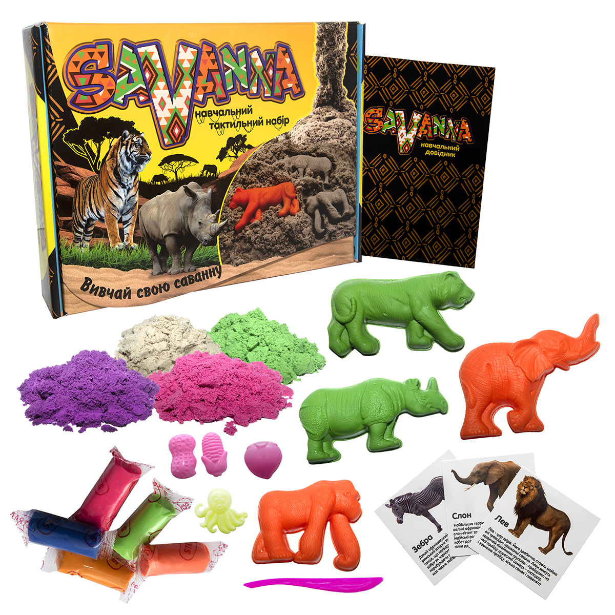 Возможность создать привлекательные просторы саванны с различными забавными обитателями даст возможность малышу набор Savanna. Организовать различные ландшафты можно с помощью кинетического песка - удивительного материала. Пластичная масса, состоящая из натурального песка, связанного в одну массу полимером, позволяет вылепить любую игровую фантазию и напоминает влажный песок на пляже.