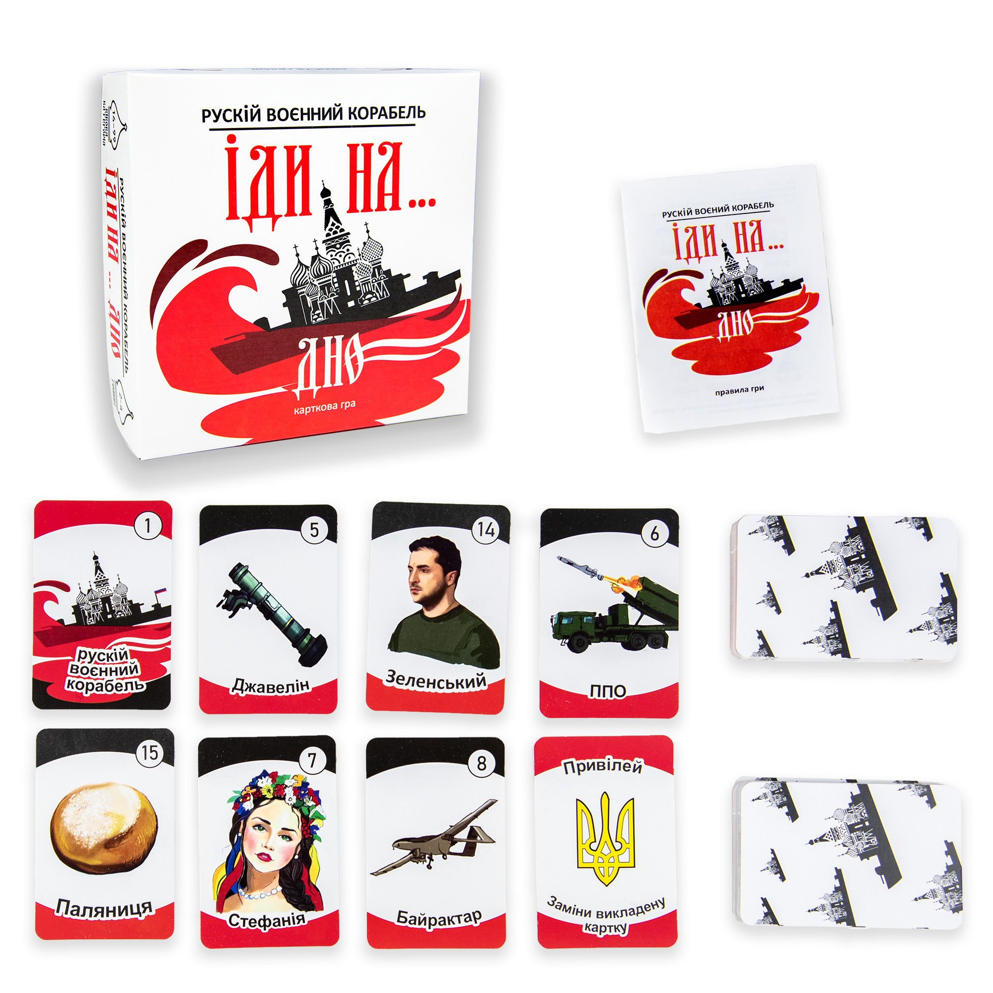 Печально известный корабль уже давно пошел ко дну, но вспоминать о нем хочется снова и снова. Ведь это история как из легенд, в которых пожелание смелого воина «Русский военный корабль иди на… дно» очень скоро свершилось. В этой карточной игре мы предлагаем снова перебить вражеский корабль и выиграть с помощью Байракторов, ведьм Конотопа, Волонтеров и других. Для этого понадобится ваша память, внимание и компания друзей.