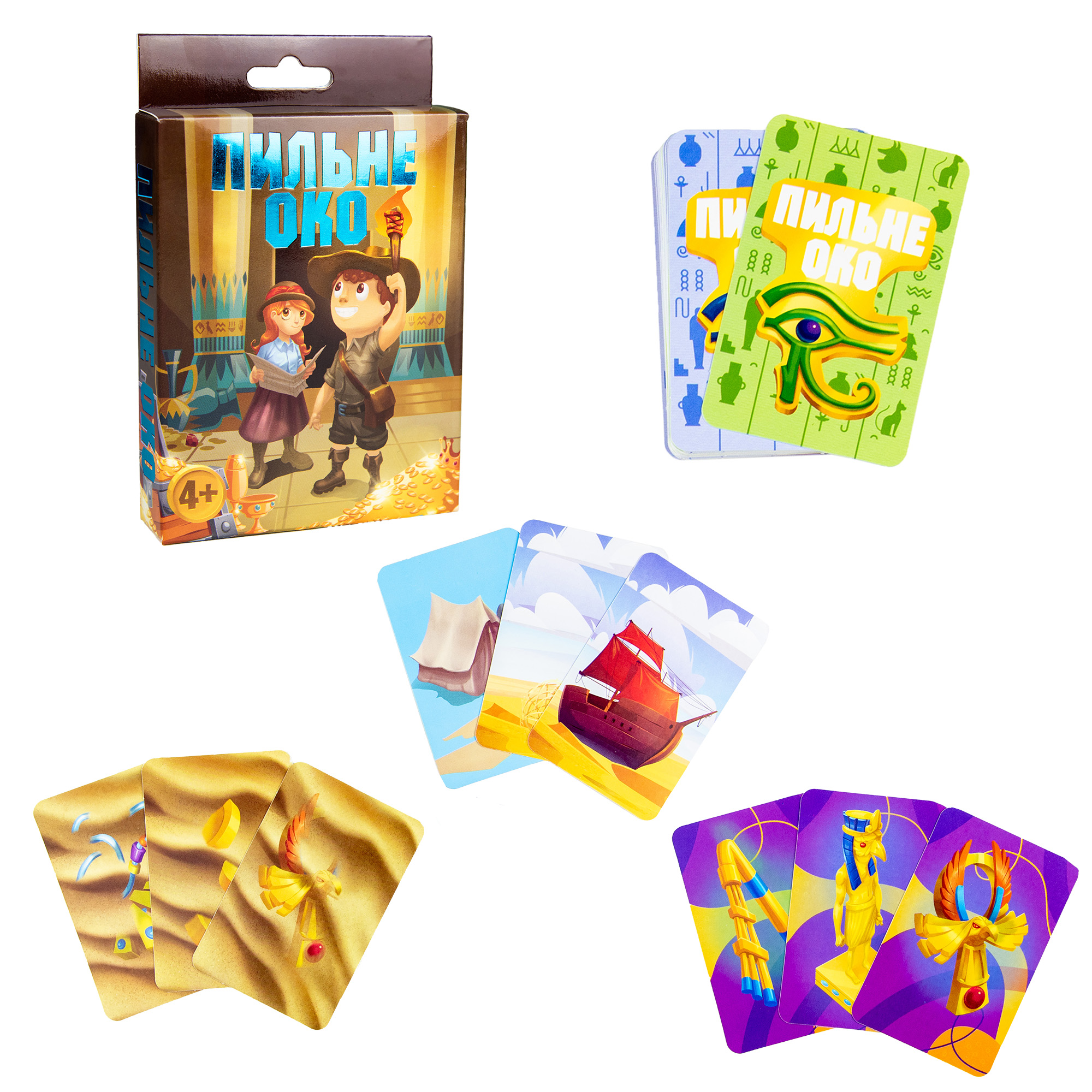 4 карточки с лагерями археологов, 1 карточка с лагерем контрабандистов, 28 карточек поиска артефактов, 14 карточек потерянных артефактов, 3 специальные карты. Всего 55 карт, инструкция.