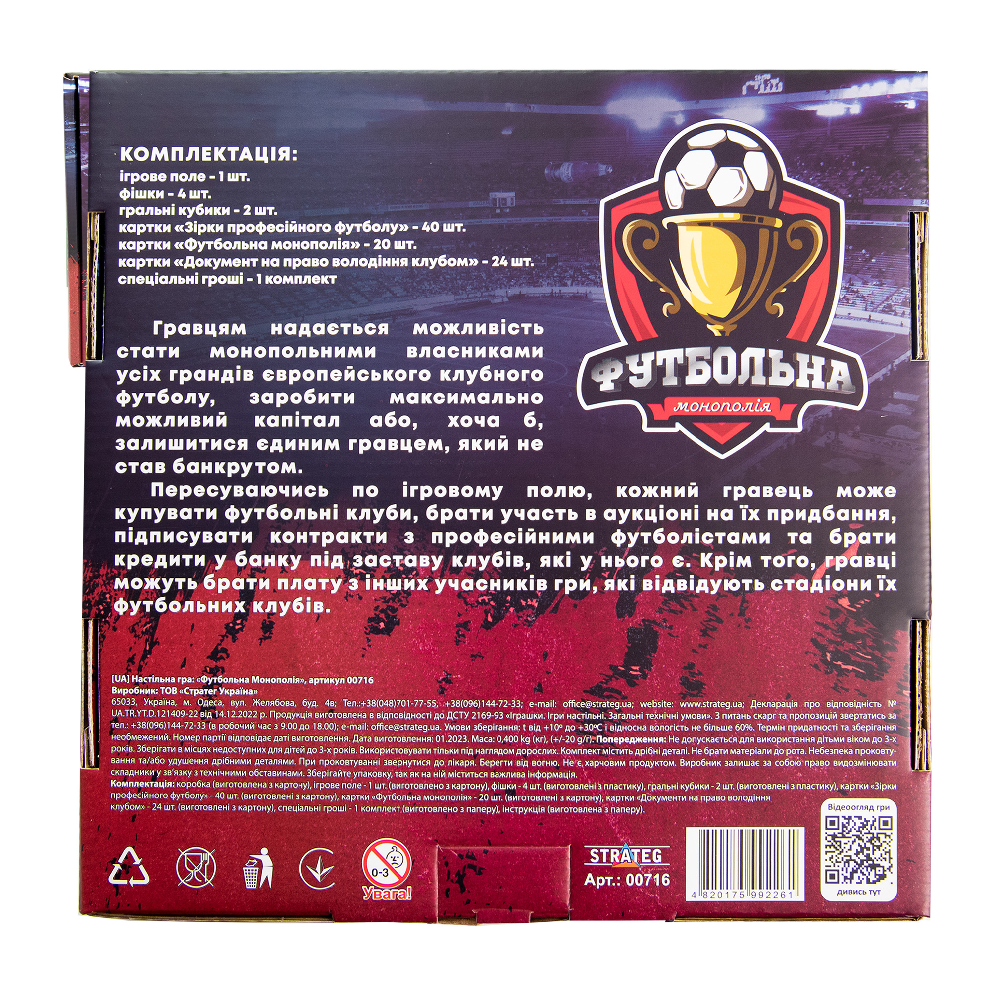 На яскравих картках зображені цифри, згідно з якими потрібно робити хід. Всередині ви знайдете карти декількох зразків, гральні фішки і кубик. «Футбольна монополія» Strateg (00716) вчить поводитися з фінансами і власністю, розвиває фінансову самостійність і дозволяє вивчити основи економіки.