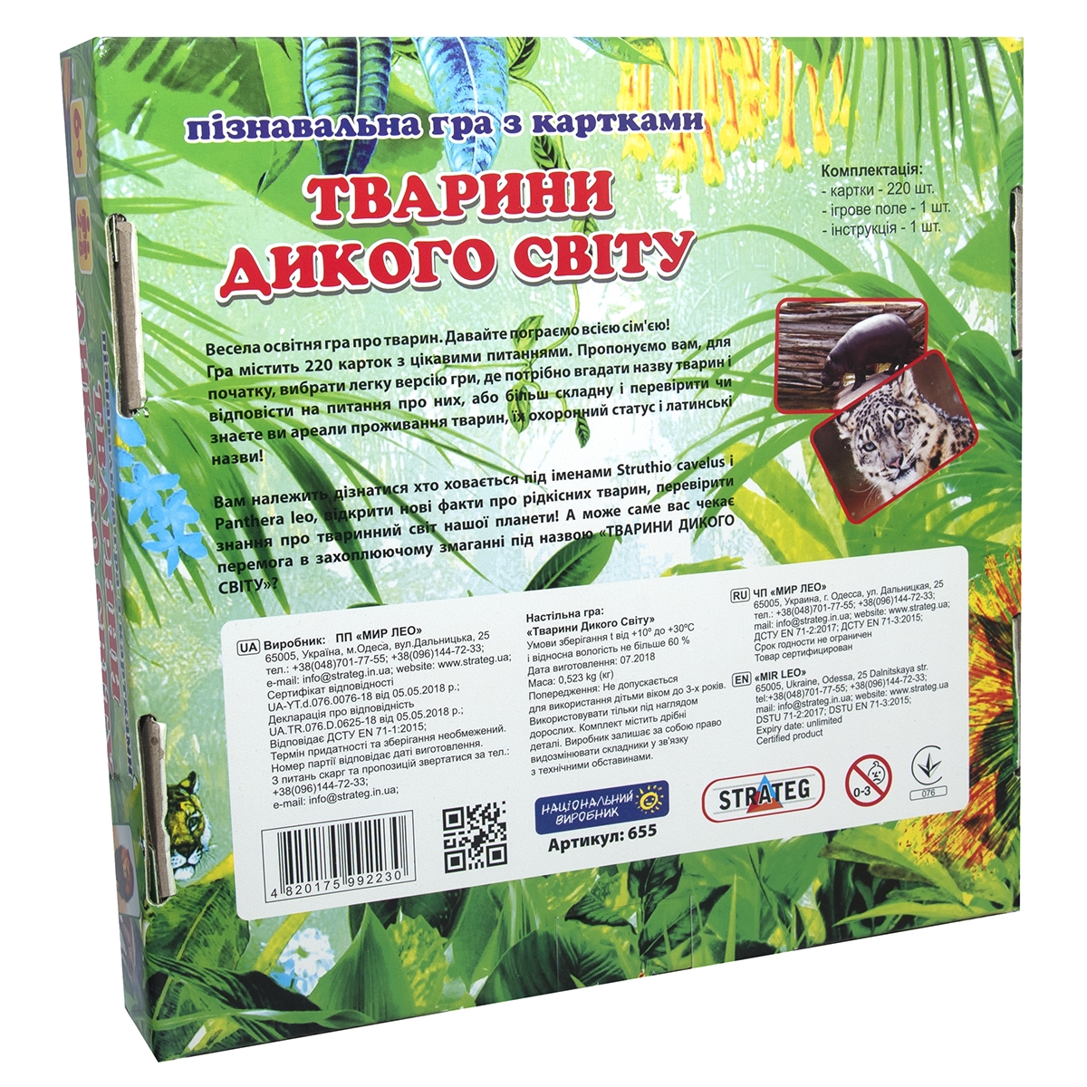 Кожна з 220 карток унікальна - на ній зображено дику тварину, питання з варіантами відповіді та цікавий факт. Гра розрахована на невелику компанію, але й самостійно перевірити свої знання також буде цікаво.