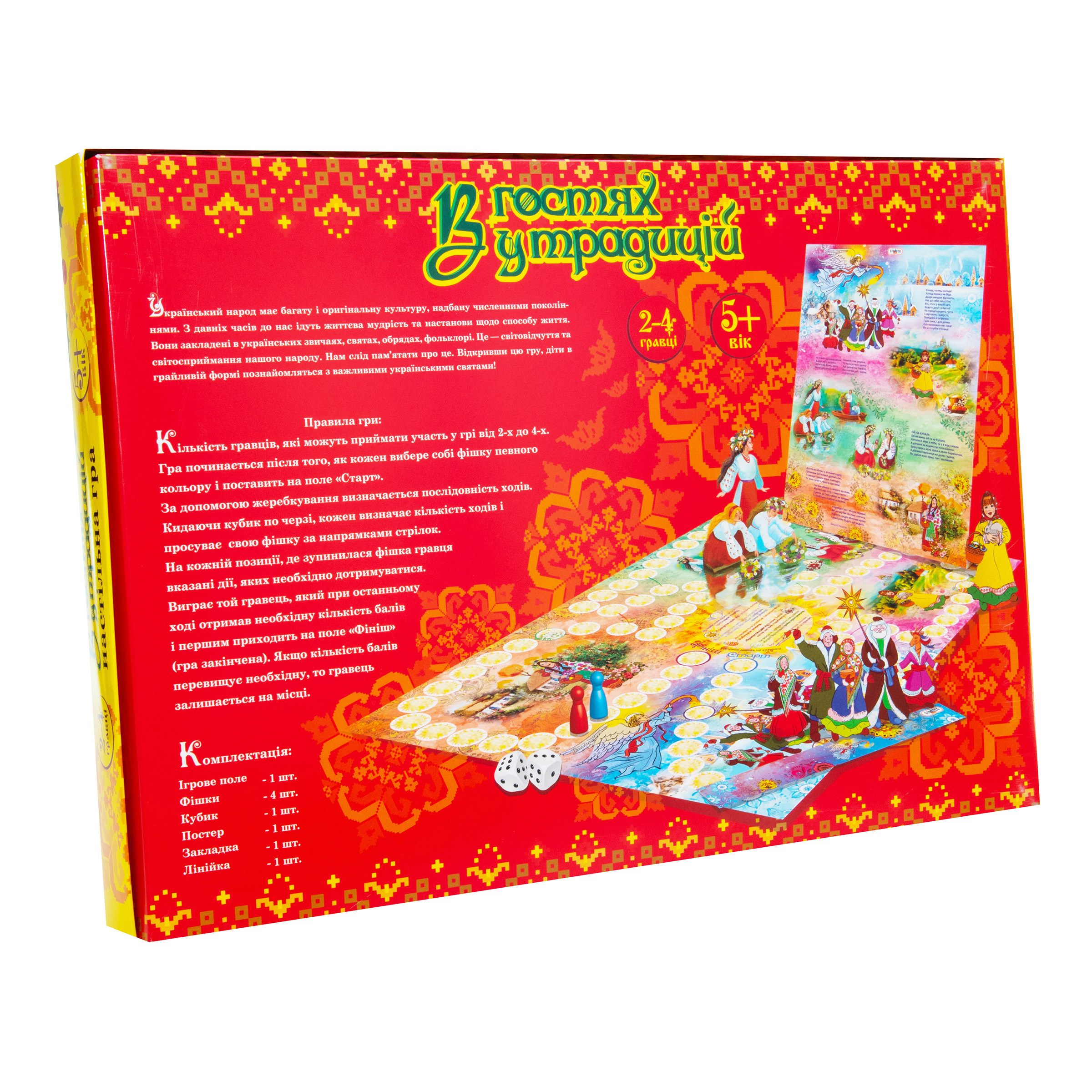 ♦ Комплект: ігрове поле, 4 фішки, кубик, лінійка, закладка, інструкція.