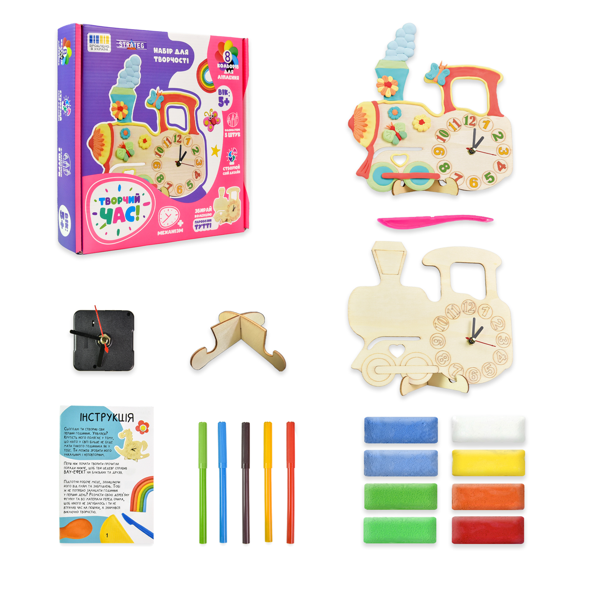 ♦ Комплектація: коробка, маса для ліплення - 8 шт., стек, корпус годинника, підставка, годинниковий механізм, фломастери - 5 шт., інструкція.
