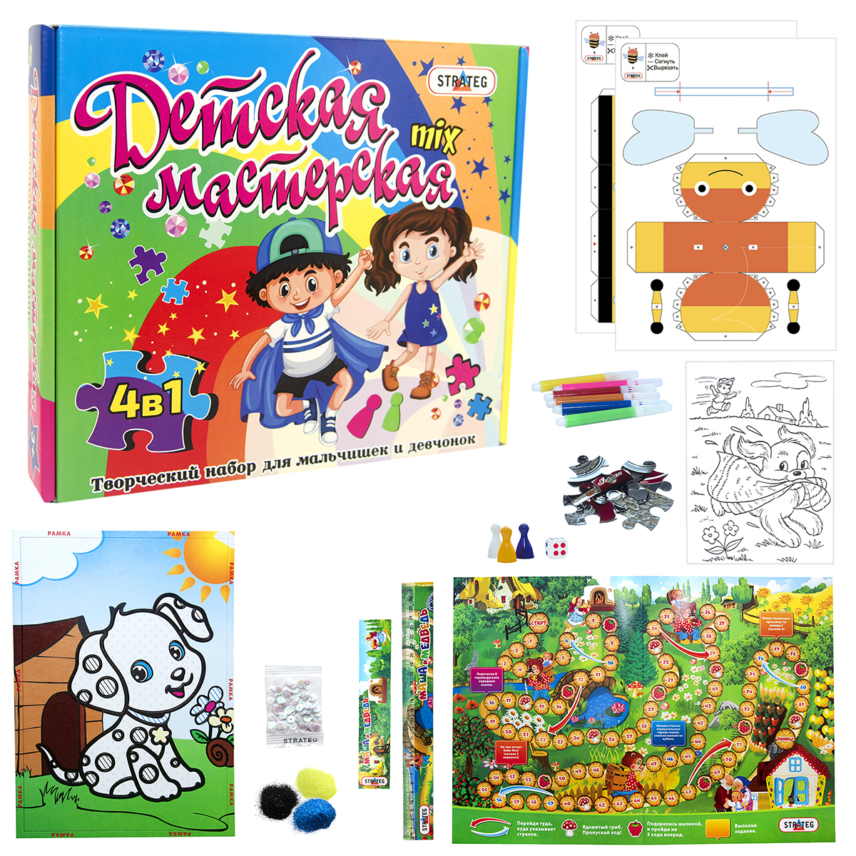 ♦ Комплектація: настільна гра, пазл, картина з гліттера та паєток, об'ємна фігура.