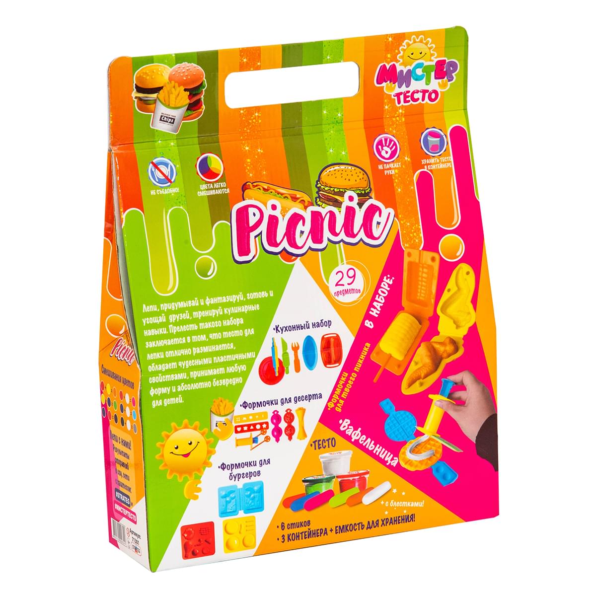 Ваш малюк любить пригощати друзів на природі? Допоможіть влаштувати йому пікнік для веселої компанії за допомогою набору «Містер тісто - Picnic». Велику кількість різних видів смачних закусок і страв допоможуть відтворити формочки для десерту, кухонний набір і формочки для приготування бургерів. Можна сфантазувати будь-який вид ласощів і виліпити його зі спеціального тіста. Тісто дуже пластичне, різні кольори легко змішуються, воно не забруднює руки і може приймати будь-яку форму. Має яскраві кольори і абсолютно безпечне. Додатковий ефект стравам додадуть стіки з блискітками!