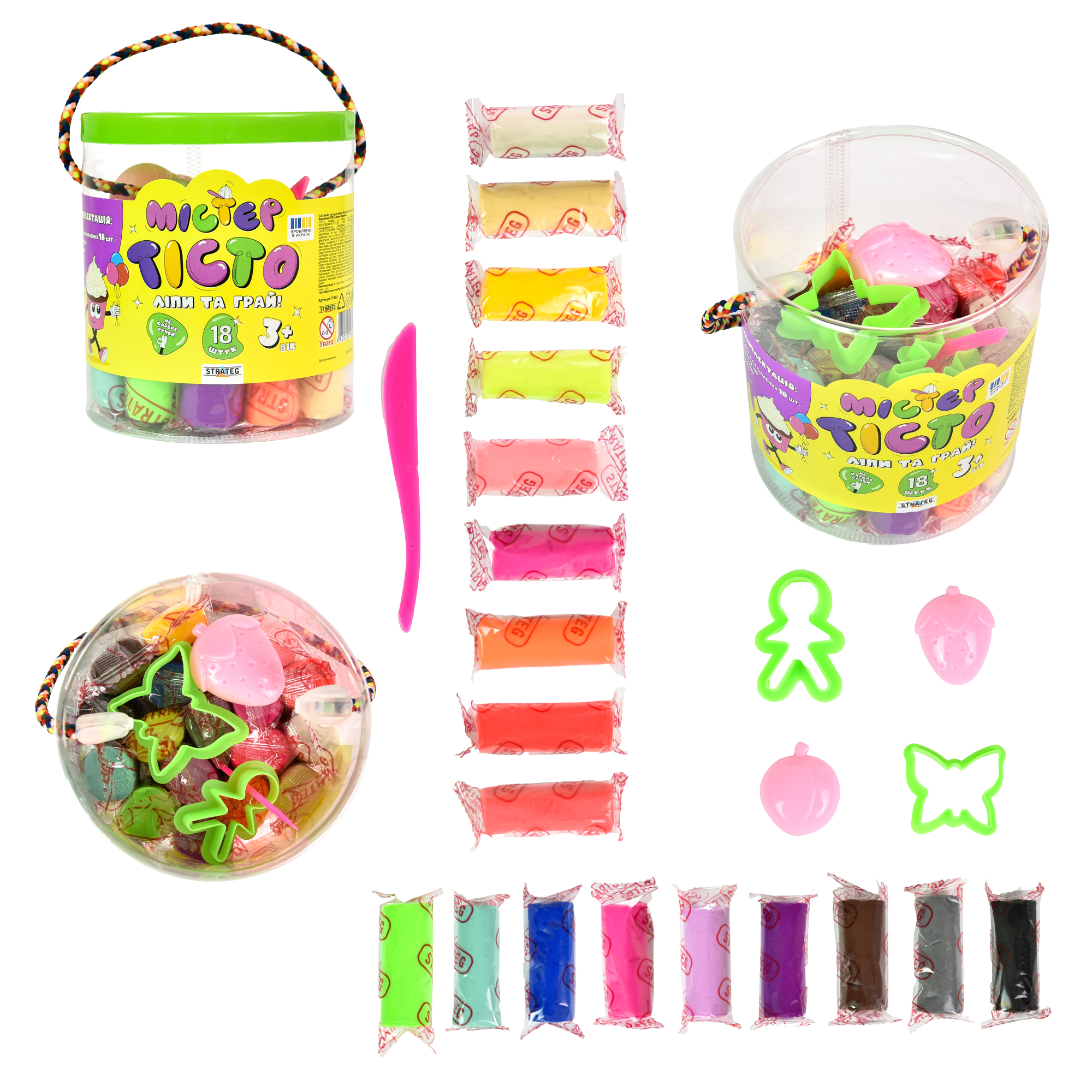 Набір тіста для ліплення (Strateg 71803) "Містер тісто 18 кольорів" стане знахідкою для шанувальників фігурок із пластиліну та подібних субстанцій. Він дуже великий - у наборі цілих 18 шматочків різнокольорового тіста. Воно не забруднює руки та є замінником простого пластиліну. І що дуже важливо – маса абсолютно безпечна для малюка.