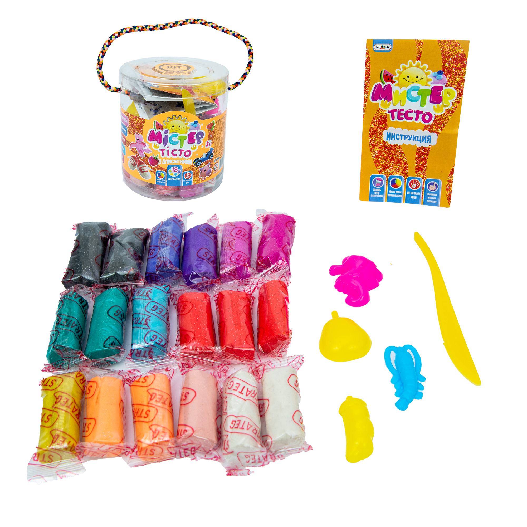 ♦ Комплектація: тісто для ліплення – 18 шт, формочки, інструкція, очі, стек, брелок.