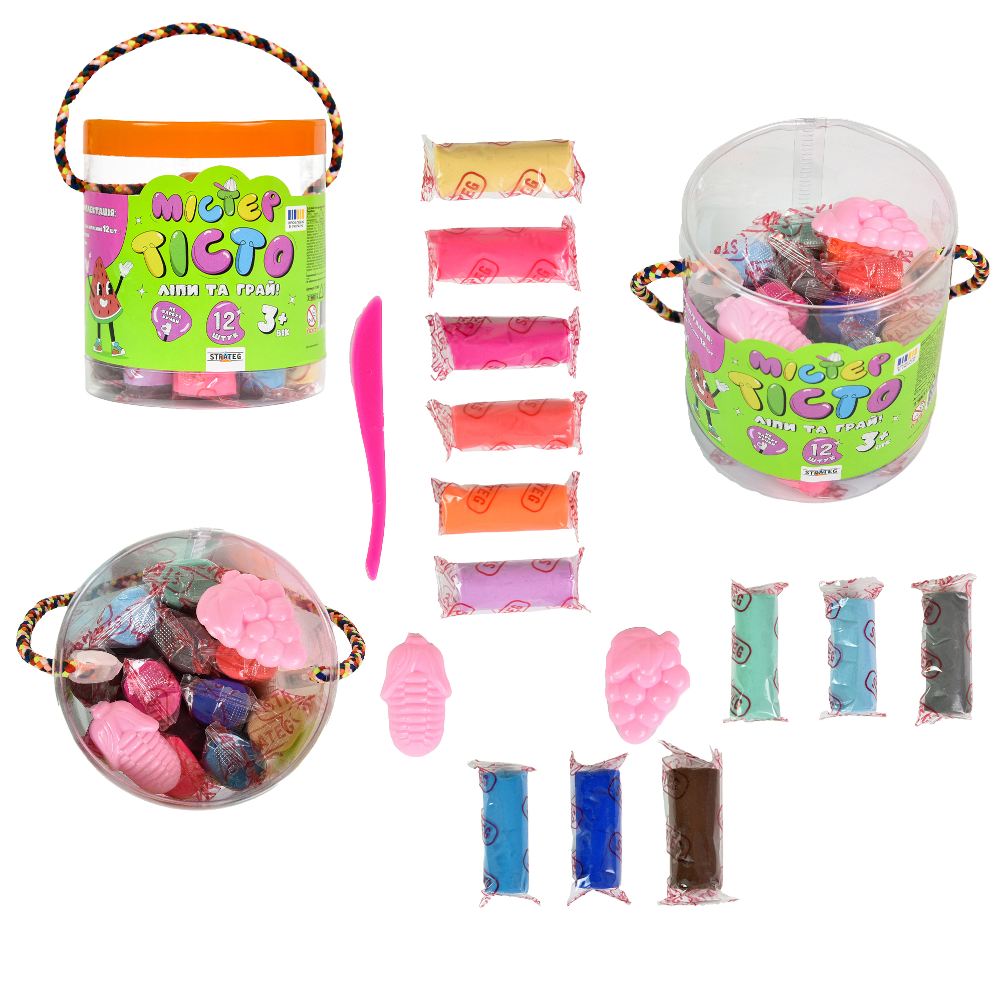 Набір тіста для ліплення (Strateg 71808) "Містер тісто 12 кольорів" стане знахідкою для шанувальників фігурок із пластиліну та подібних субстанцій. Він дуже великий - у наборі цілих 12 шматочків різнокольорового тіста. Воно не забруднює руки та є замінником простого пластиліну. І що дуже важливо – маса абсолютно безпечна для малюка.