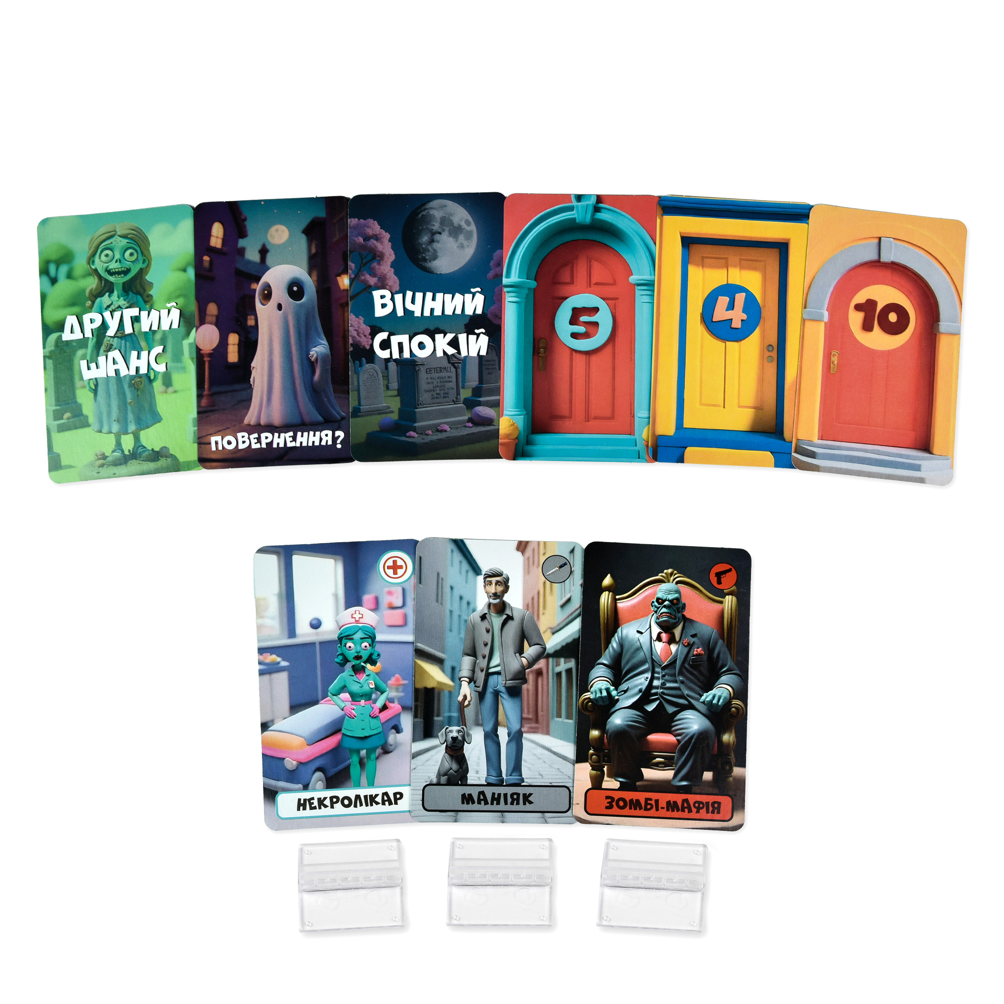 ♦ Комплектація: картки ролей - 12 шт, картки-номери - 12 шт, картки повернення - 12 шт, підставки - 12 шт, інструкція.