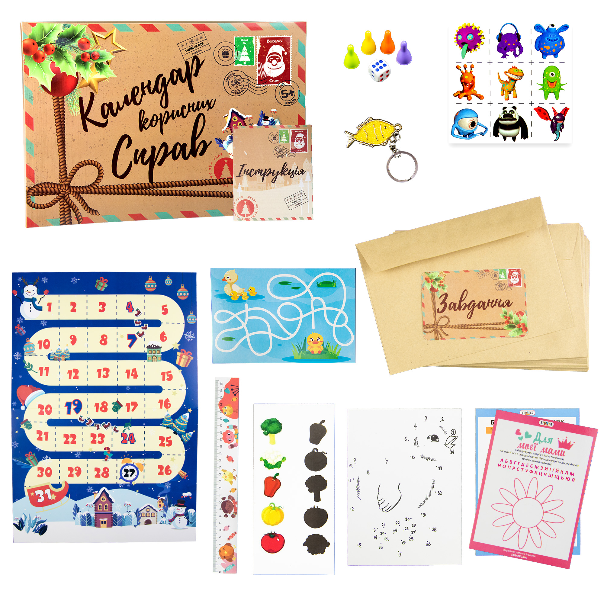 Плакат-календар, картки з завданнями – 31 шт., конверти – 31 шт., наліпки – 31 шт., ігрові фішки – 4 шт., кубик – 1 шт., набір для дитячих розваг, подарунок, інструкція.