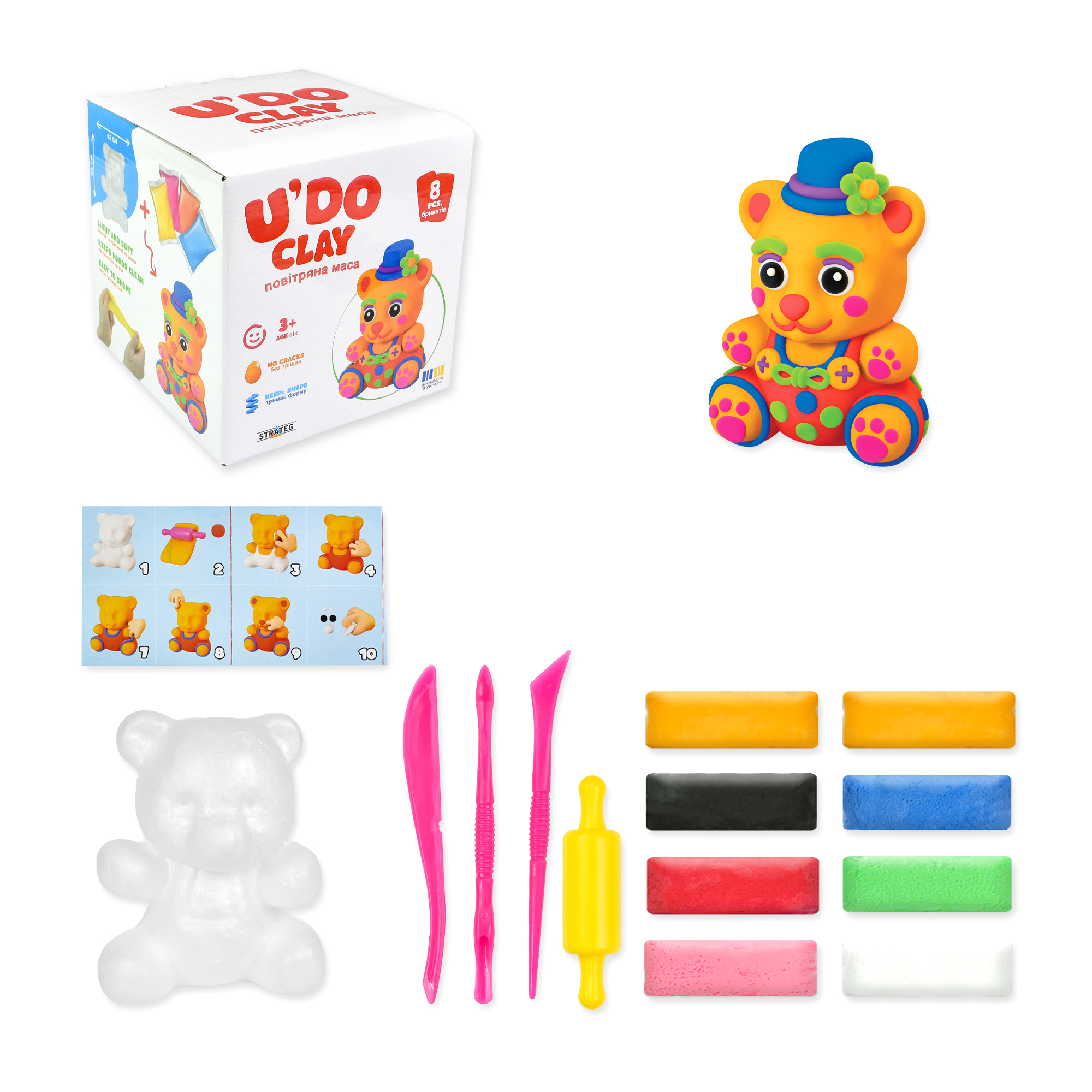 Набір для творчості U'DO Clay — це м’яка, легка повітряна маса для ліплення, що підходить для дітей від 3 років. У комплекті 8 яскравих брикетів по 15 грамів і пінопластова фігурка для декорування. Масу зручно змішувати, вона не тріскається після висихання і добре тримає форму. Працювати з нею чисто й легко — не липне до рук. Ідеально для розвитку фантазії, дрібної моторики та кольорового мислення. Безпечна та нетоксична.