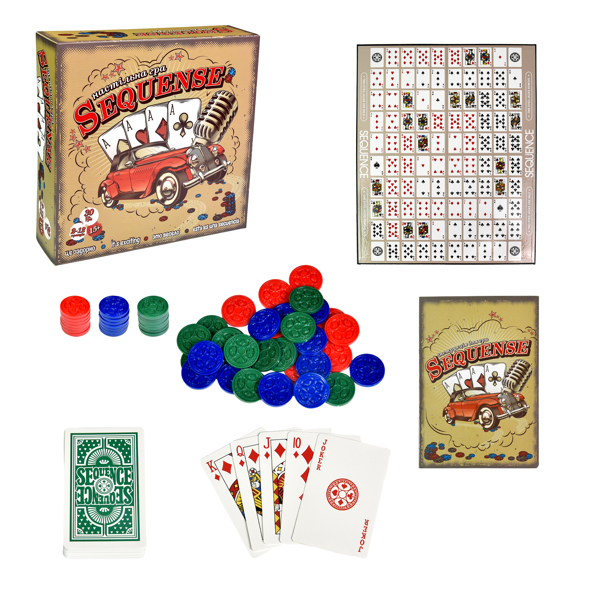 Захоплююча гра з елементами різних стратегічних ігор «Sequense» зможе зацікавити не лише дітей, а й дорослих, дасть можливість захоплююче провести час всій родині, при цьому розвинути уважність, стратегічне мислення та просто розважитися. На ігровому полі необхідно збудувати послідовність фішок однакового кольору, які встановлюються залежно від зіграних карток. Але це ще не все! Самі фішки можуть зніматися залежно від правил – продумайте свої ходи та стратегію. Гра викликає інтерес з перших ходів!