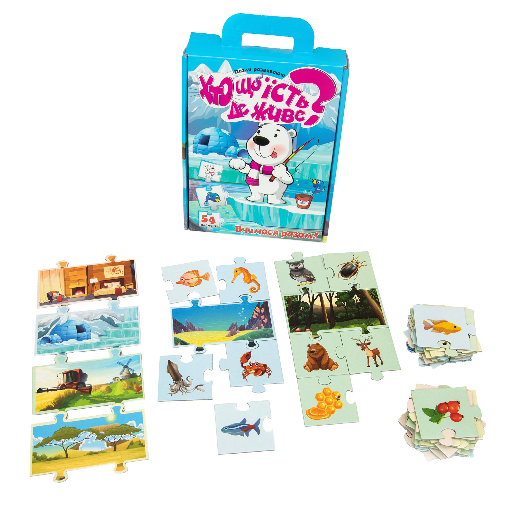 «Хто що їсть? Де живе? »30910 - це цікава гра, яка розвиває логічне мислення дітей і дає можливість дізнатися більше про тварин світу. Діти в ігровій формі з'ясовують, де живуть і чим харчуються тварини, та збирають невеликий пазл із карток. Таким чином швидше закріплюються знання та розвивається логічне мислення та уважність.